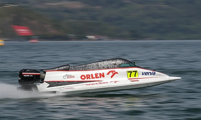 Pembalap asal Polandia Bartek Marszalek berada di posisi pertamanya selama 50 tahun karirnya sebagai atlet balap perahu motor pada Qualifikasi F1H2O Balige, Minggu (26/02/2023). (Foto: PARBOABOA)