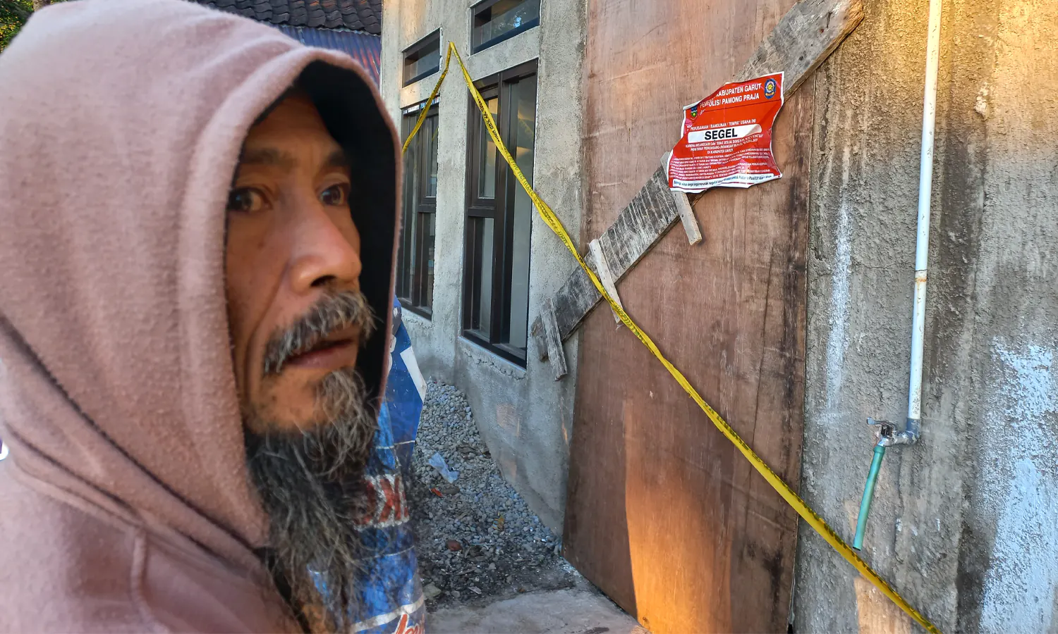 Ade Sumpena menunjukkan segel masjid milik jemaah Ahmadiyah di Kampung Nyalindung, Kabupaten Garut, Jawa Barat, Selasa (16/7/2024). (Foto: PARBOABOA/Achmad Muazam)