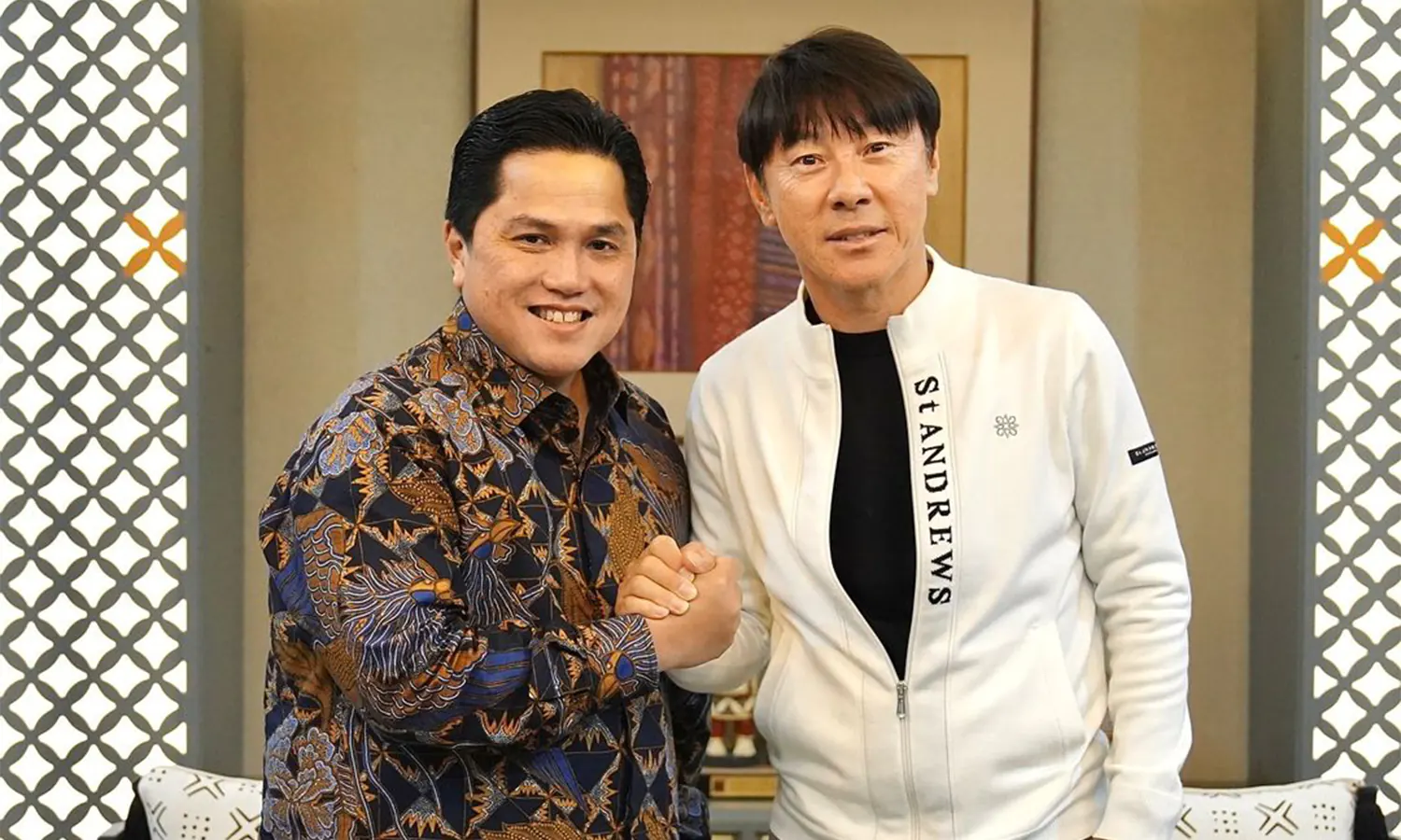 Ketua PSSI Erich Thohir berjabatan tangan dengan pelatih Timnas Indonesia STY pasca penandatanganan perpanjangan kontrak (Foto: Instagram/@erichthohir)