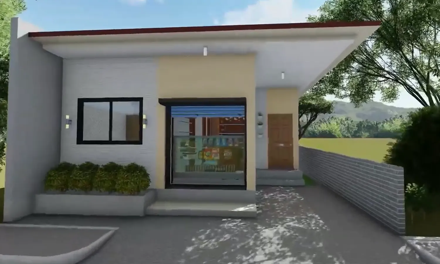 Di area tersebut, kamu bisa mendesain toko kecil dengan rolling door serta atap kanopi di bagian depannya