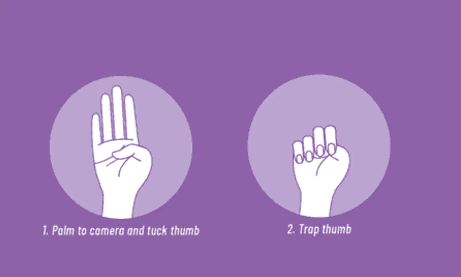 Korban membuat tanda dengan mengangkat telapak tangannya, kemudian melipat ibu jari ke tengah dan menutup ibu jari tersebut dengan empat jari lain.