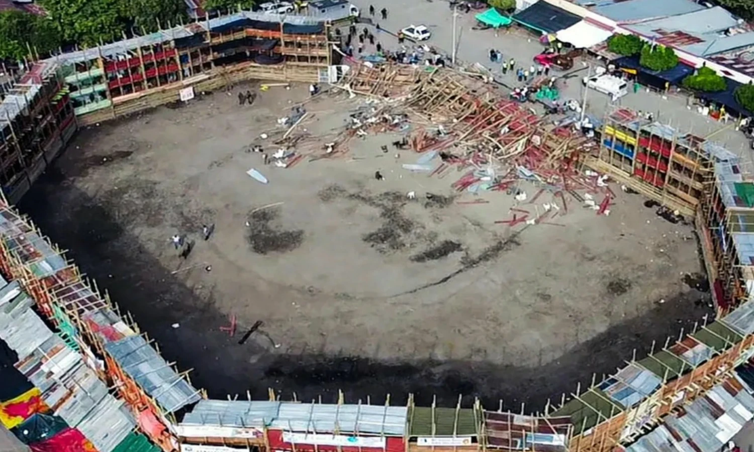 'Grandstand' bertingkat tiga yang terbuat dari kayu itu roboh saat para penonton sedang bersorak-sorai menyaksikan acara adu banteng amatir yang digelar di Kota El Espinal.