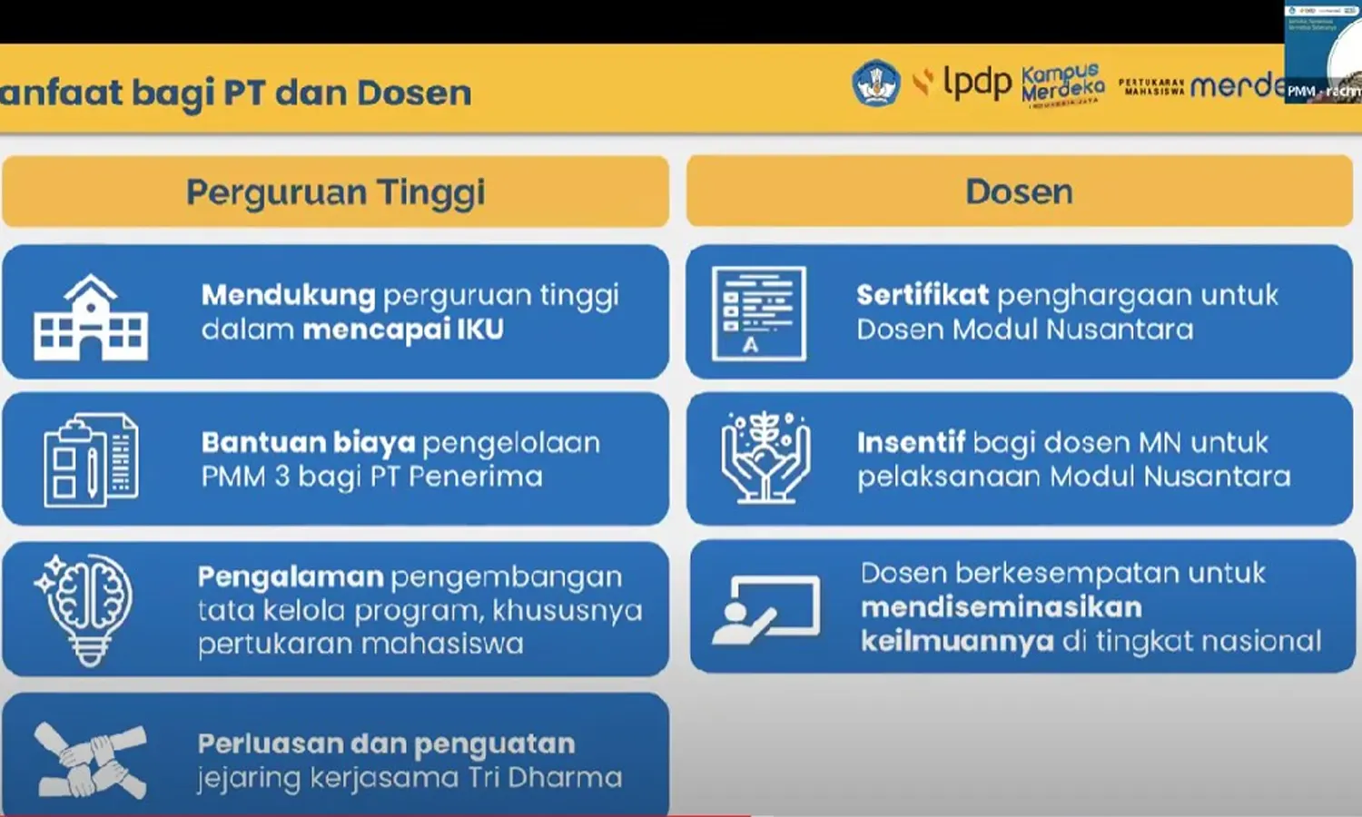 Hal tersebut disampaikan oleh Plt. Direktur Jenderal Pendidikan Tinggi, Riset, dan Teknologi, Nizam dalam kegiatan sosialisasi PMM 3 ke perguruan tinggi penerima, Rabu (07/12/2022) lalu.